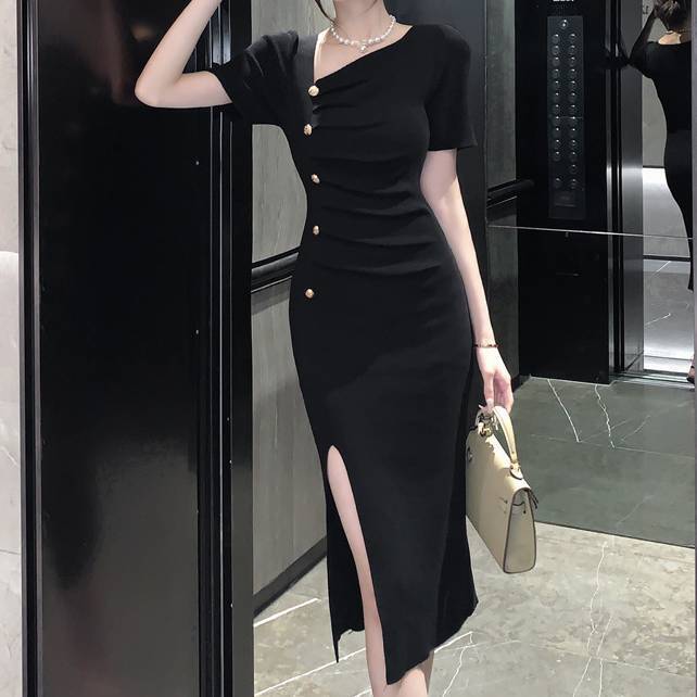 エレガント アシンメトリー スリット ワンピース タイトワンピース レディース ブラック 上品 韓国風 お呼ばれ 二次会 パーティー 食事会 デート 大人 セクシー スタイリッシュ きれいめ ワンピース C-OSS0243