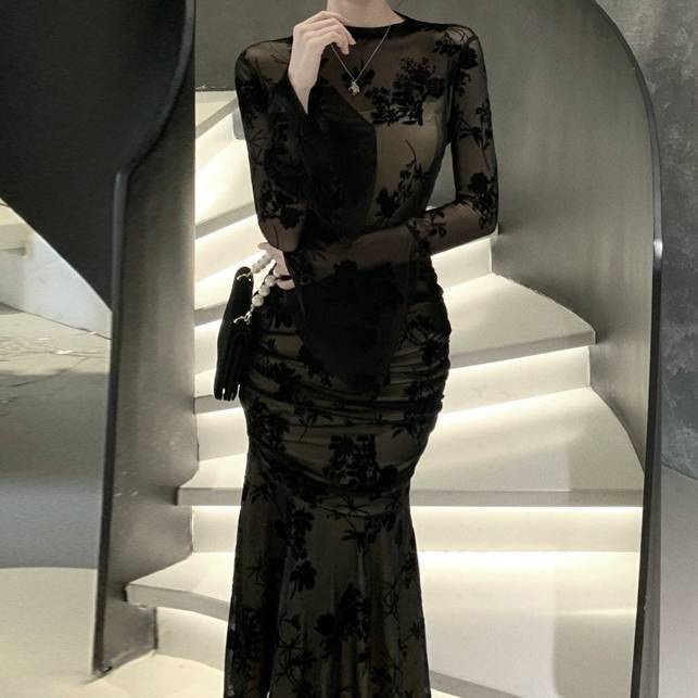エレガントレース シアーワンピース ロングドレス 透け感 レディース ワンピース タイトドレス マーメイドライン 長袖 ドレス セクシー 上品 韓国ファッション デート お呼ばれ 二次会 パーティー 秋冬 春夏 ブラック 1色展開 C-OSS0252
