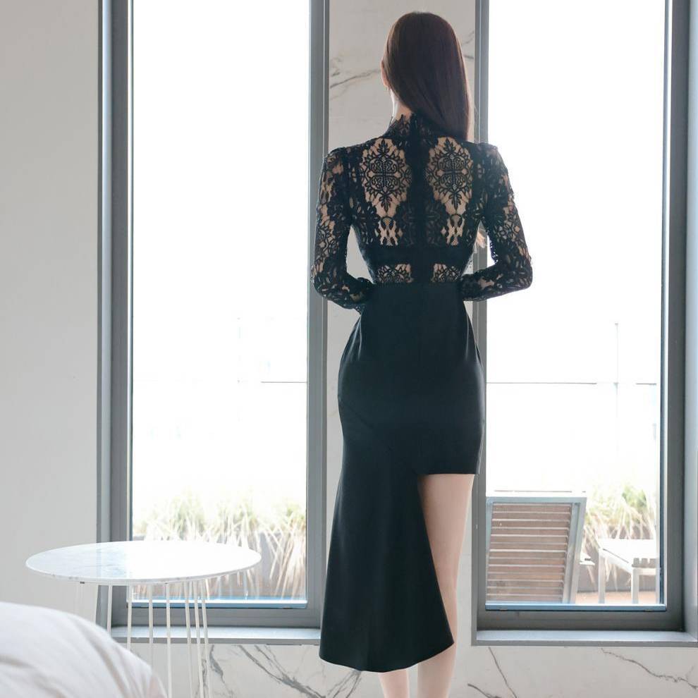 レース 長袖 セクシーワンピース アシンメトリースカート タイトワンピース パーティードレス ドレス レディース エレガント きれいめ 韓国風 結婚式 二次会 お呼ばれ 発表会 上品 美脚 美シルエット ブラック ブルー 2色展開 C-OSS0253