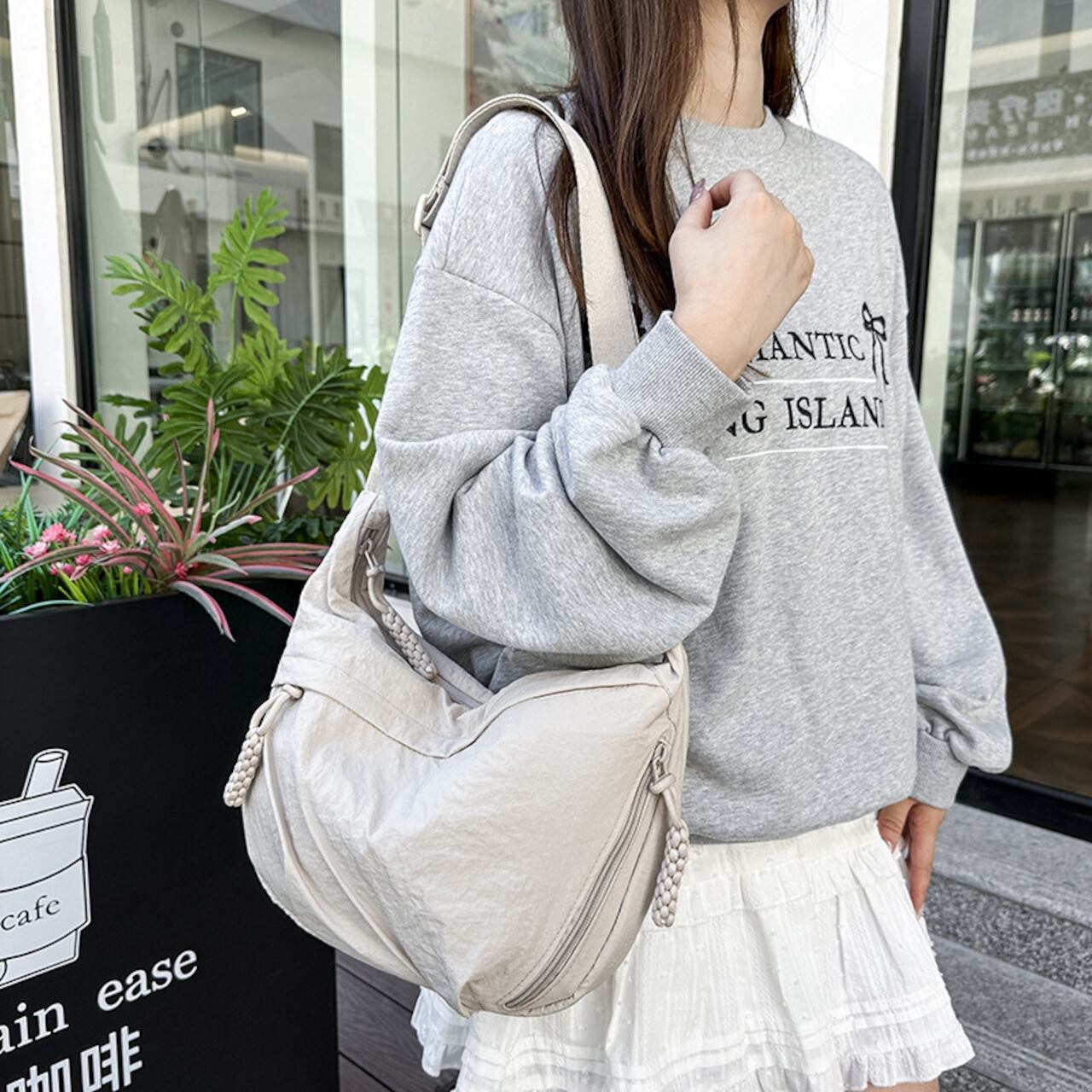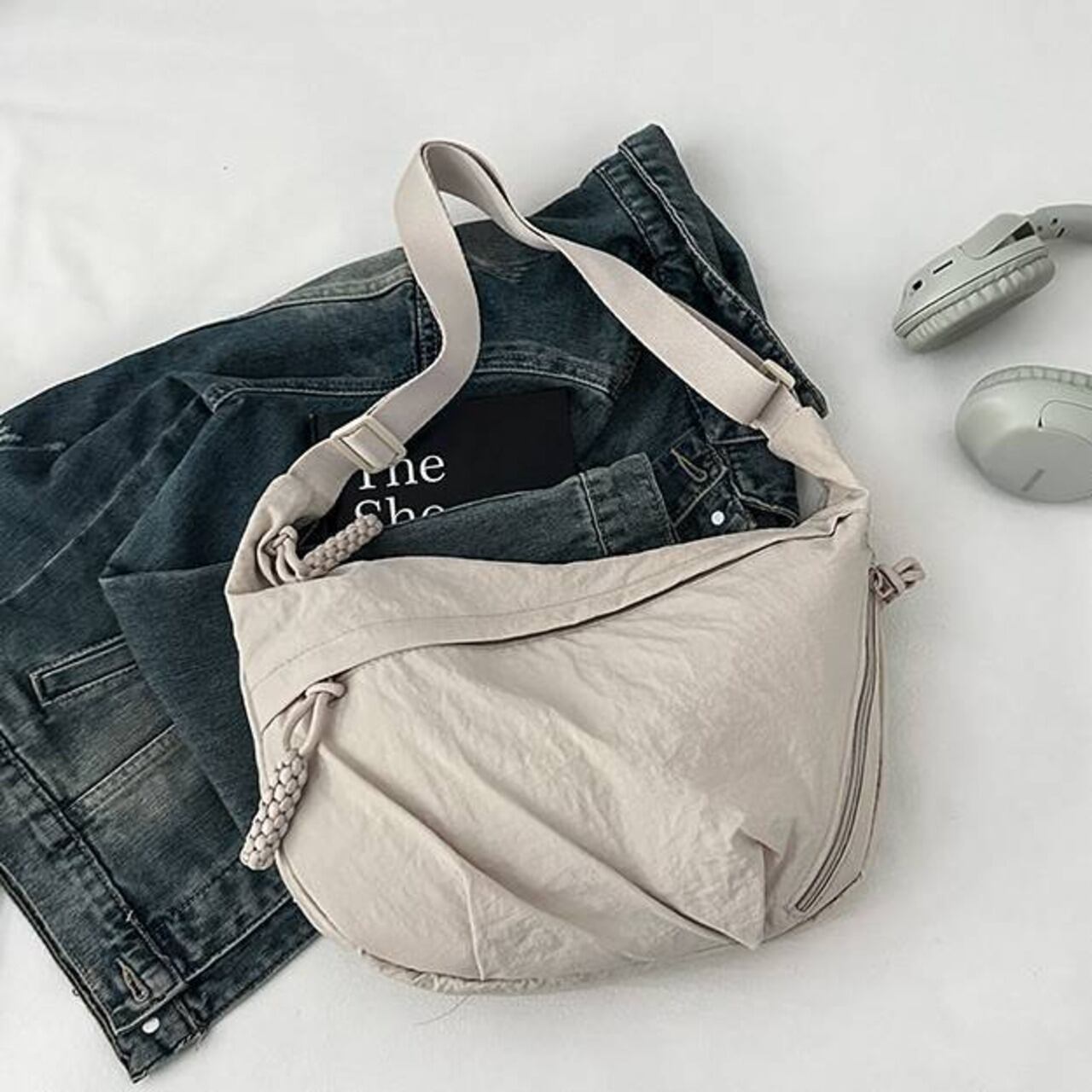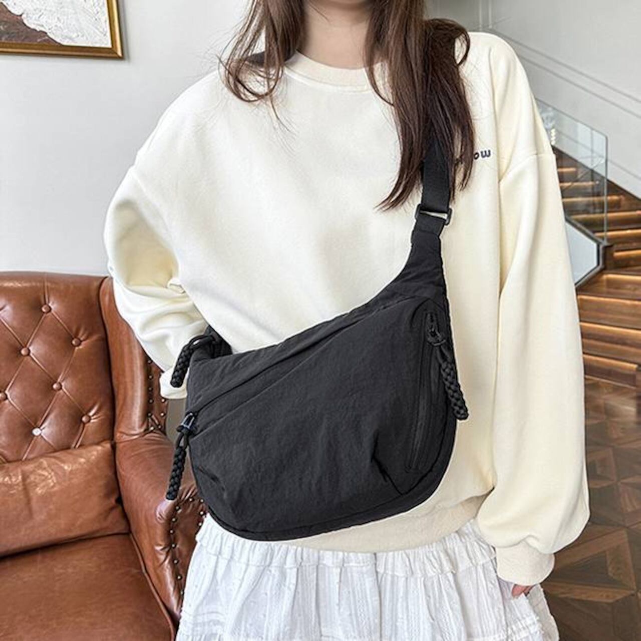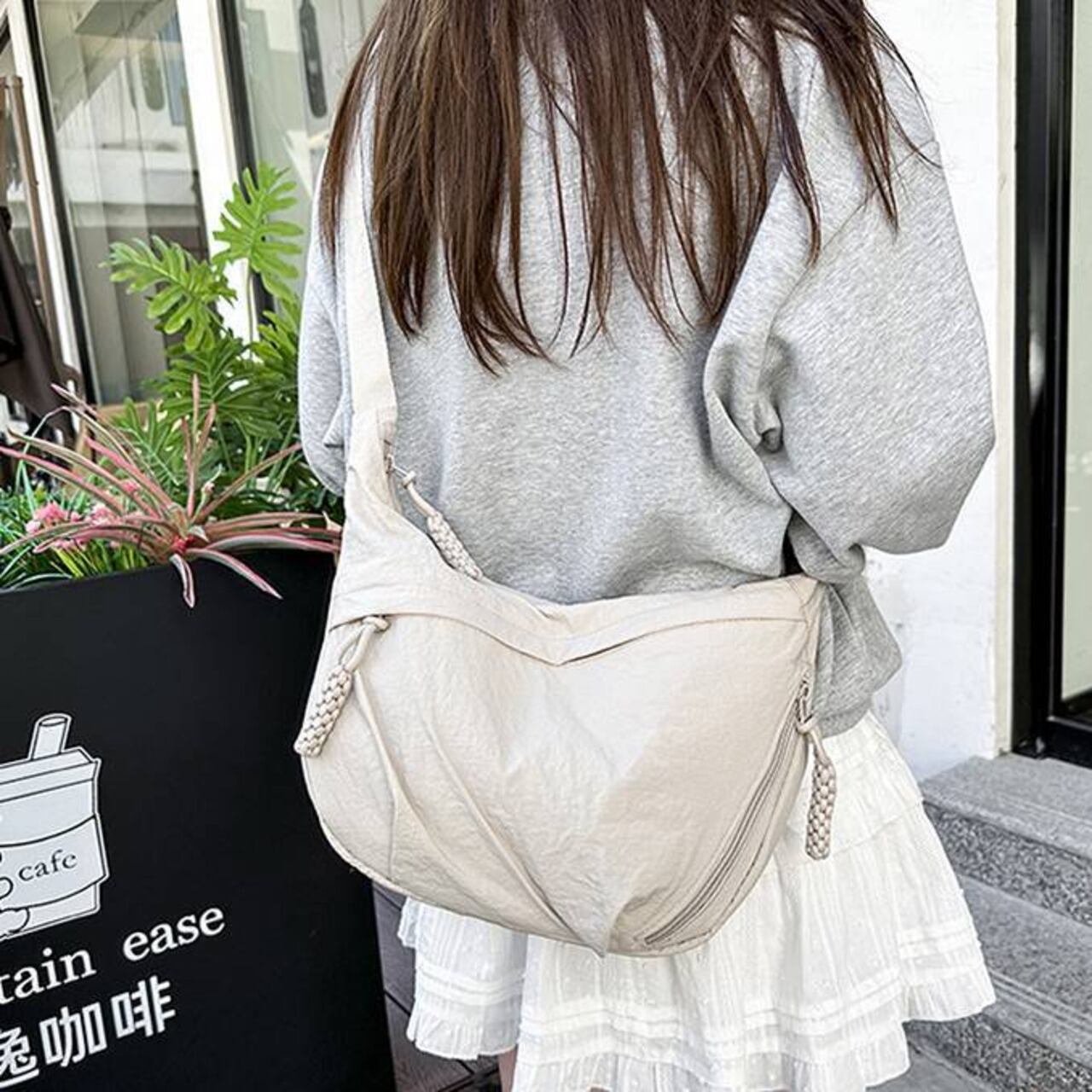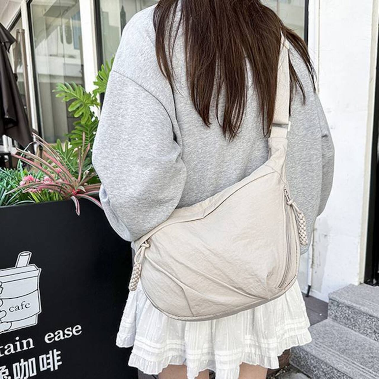 毎日のコーデにすっとなじむ、軽量でやわらかなナイロンクロスボディバッグ。シンプルな無地デザインと程よいボリューム感で、カジュアルからナチュラル、韓国ファッションまで幅広いスタイルにマッチします。身体に沿うようなフォルムで、長時間の外出でもストレスなく使えるのが魅力です。