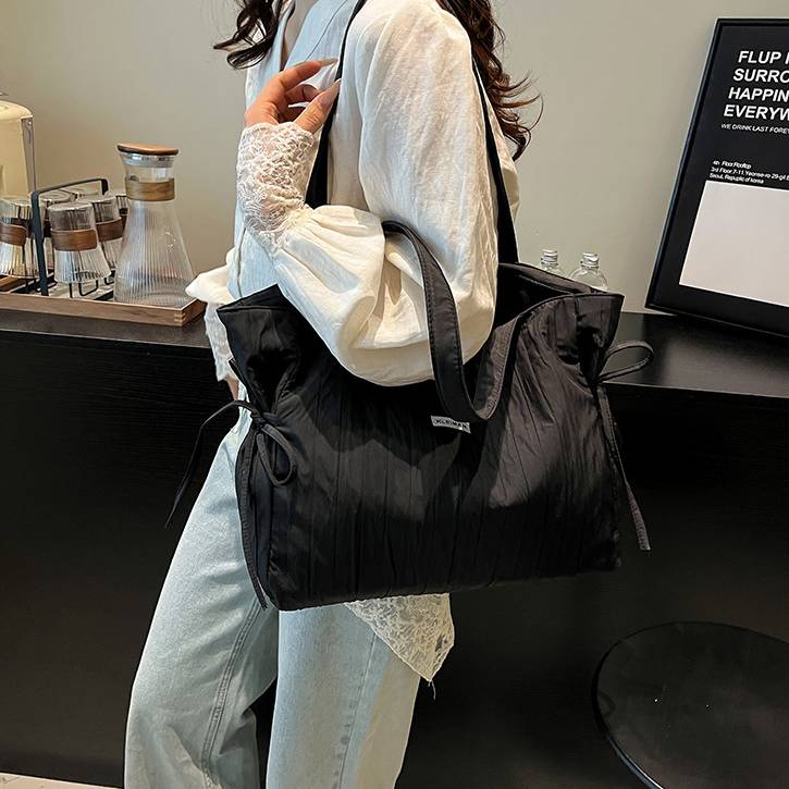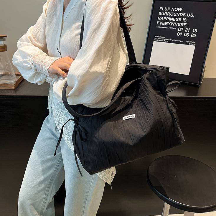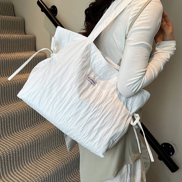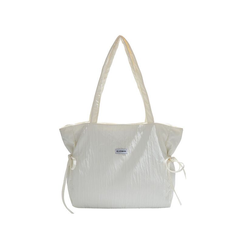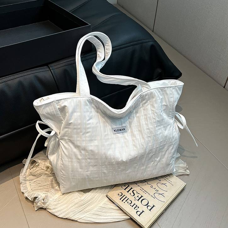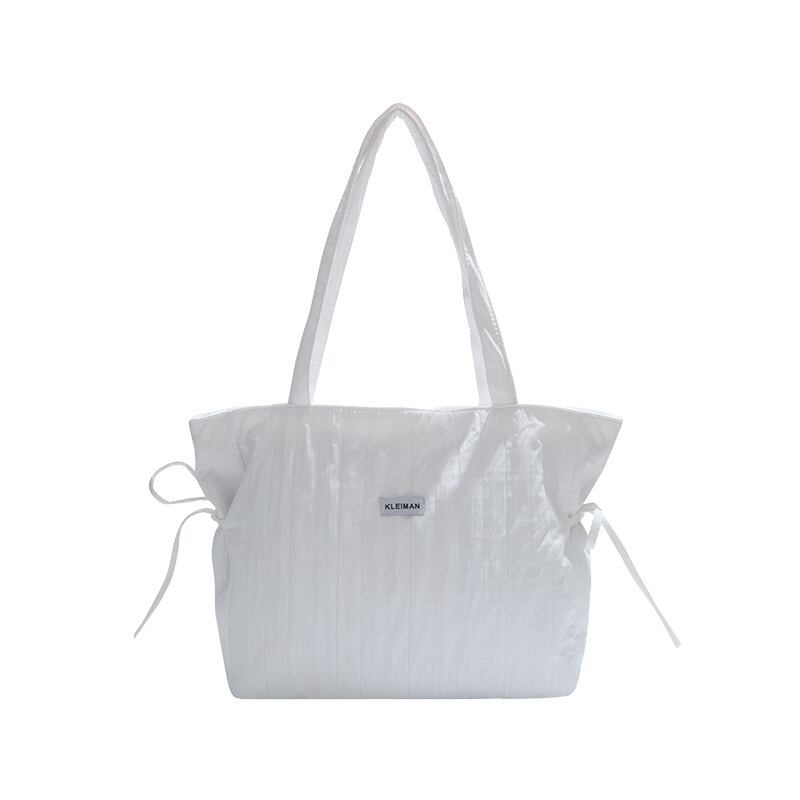 サイドのリボンデザインがさりげないアクセントになり、シンプルながらも女性らしさをプラス。ブラック・ピンク・オフホワイト・ホワイトの使いやすいカラー展開で、季節を問わず長く愛用できる万能トートバッグです。