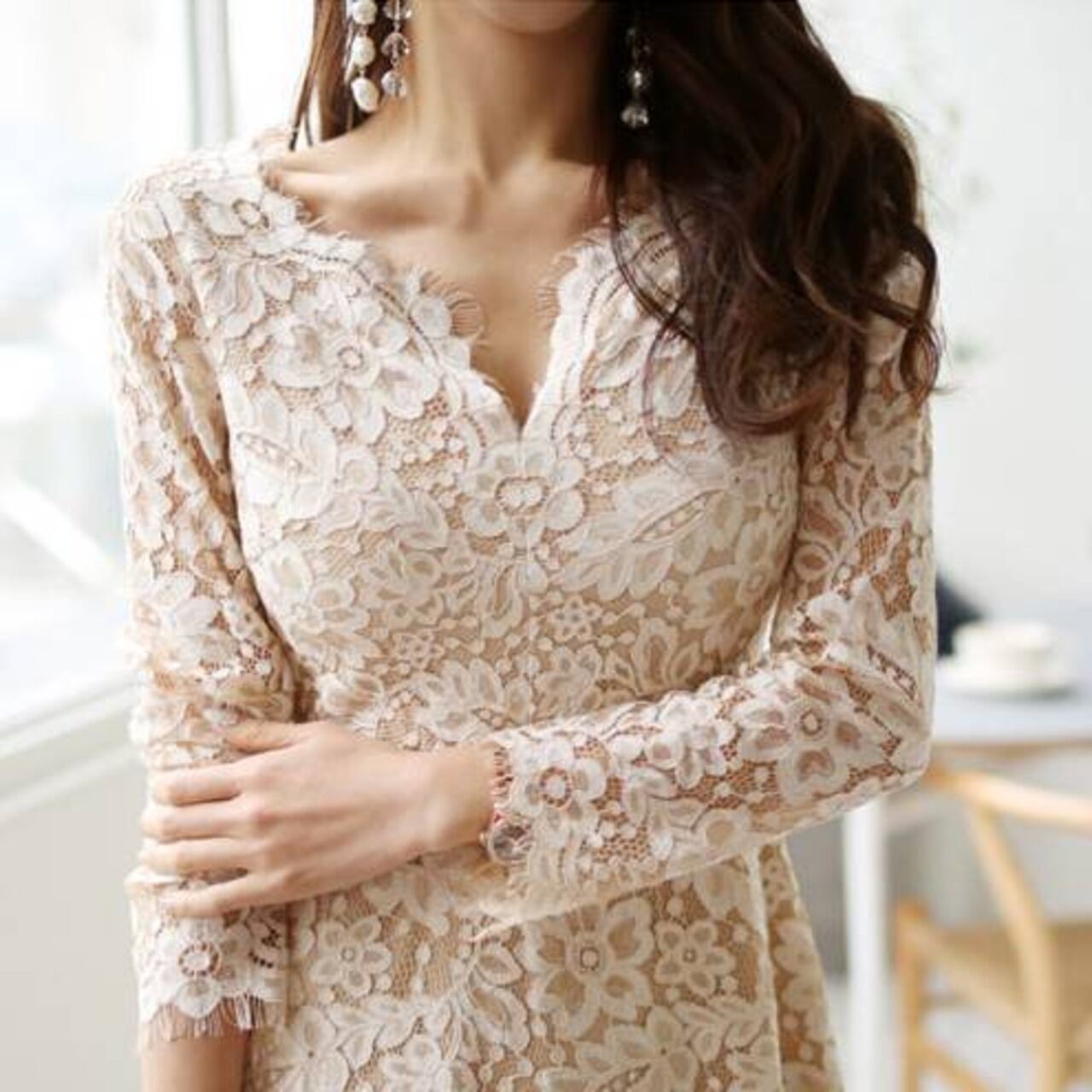 Vネックのやわらかなデザインと、ウエストラインを美しく見せるシルエットにより、スタイルアップ効果も抜群。長袖レースが腕を華奢に見せてくれるため、体型カバーも叶う嬉しい一着です。動くたびに繊細な柄が揺れ、フェミニンで魅力的な雰囲気を演出します。