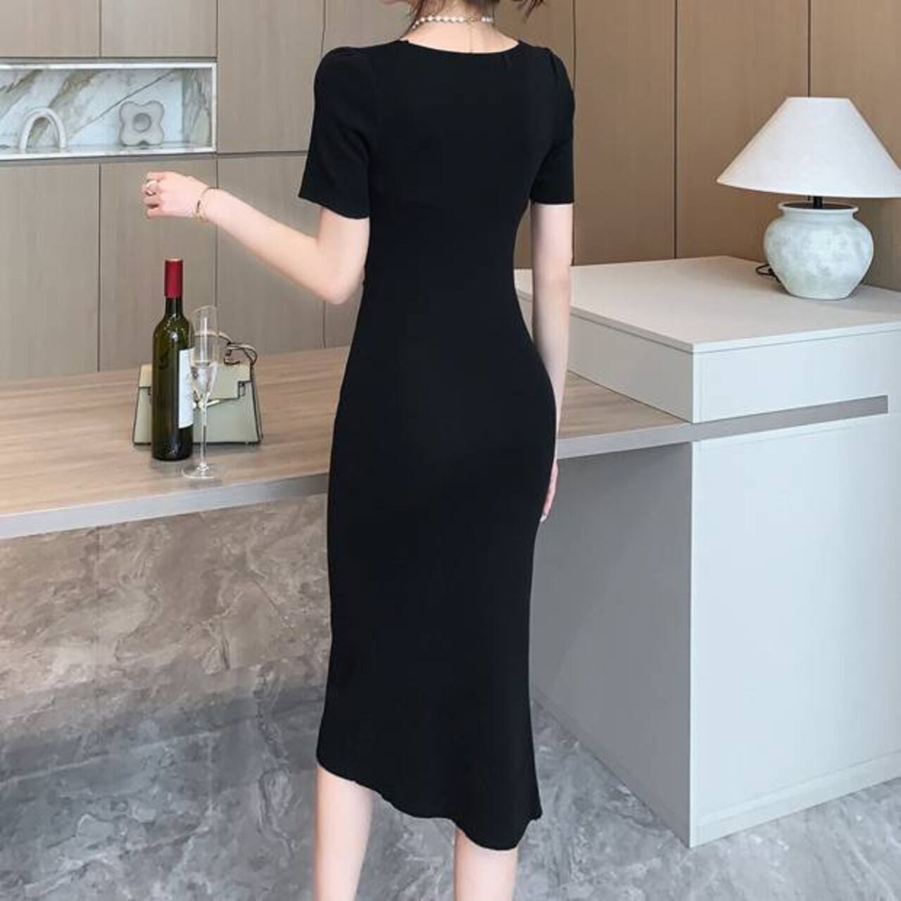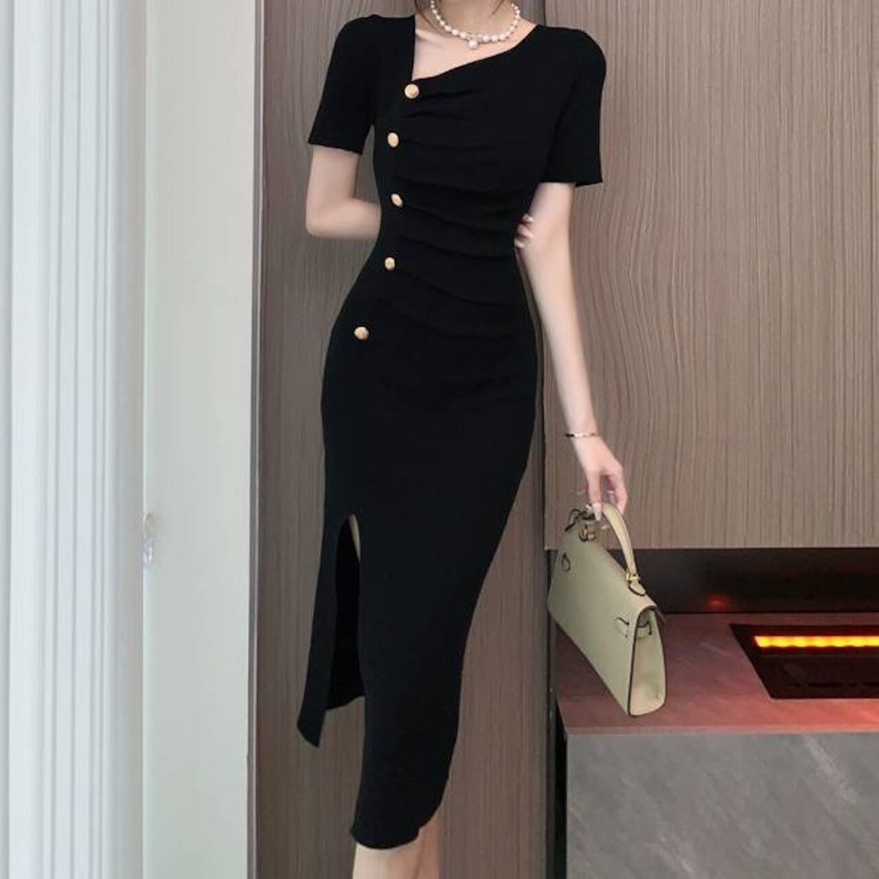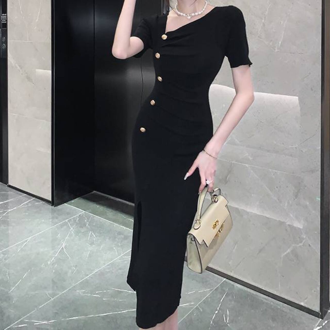 エレガント アシンメトリー スリット ワンピース タイトワンピース レディース ブラック 上品 韓国風 お呼ばれ 二次会 パーティー 食事会 デート 大人 セクシー スタイリッシュ きれいめ ワンピース C-OSS0243