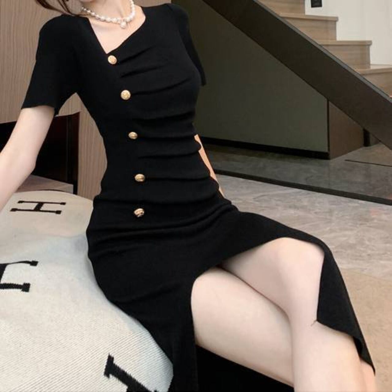 身体のラインを立体的に美しく魅せるタイト設計と、視覚効果を高めるアシンメトリーボタンを組み合わせた上品ワンピース。ブラックのワントーンは大人の落ち着きを演出しつつ、女性らしい色気も程よくプラス。ホテルディナーや二次会、デートなど特別な場面はもちろん、普段のきれいめコーデにも活躍します。