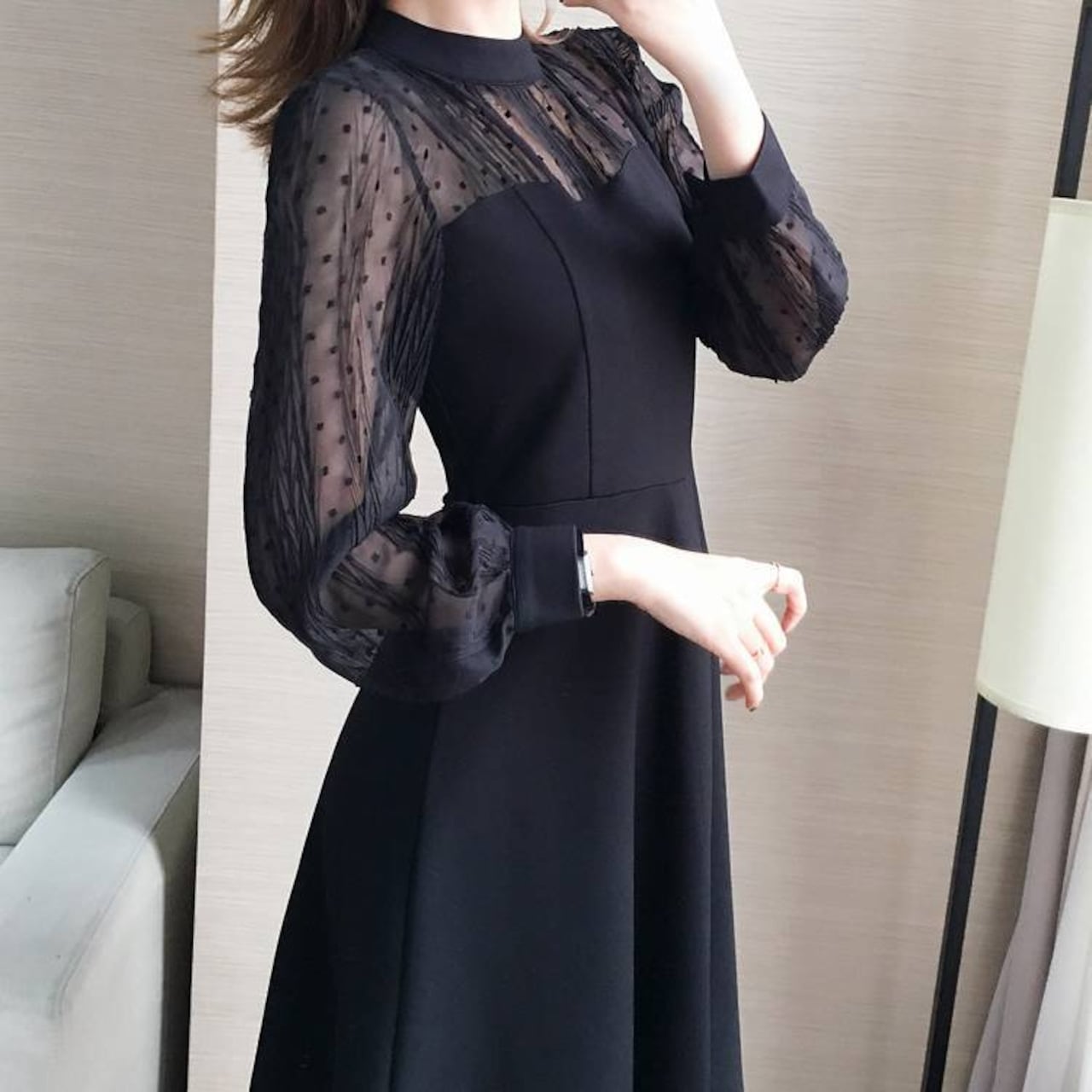 エレガント ドットチュール 切り替え ワンピース フレアワンピース 長袖 シースルー袖 きれいめ ブラック 上品 可愛い 大人女子 デート 通勤 お呼ばれ 体型カバー レディース ワンピース 春夏 秋冬 コーデ 人気 おしゃれ C-OSS0237