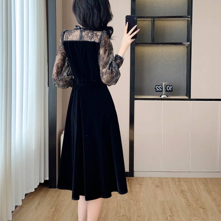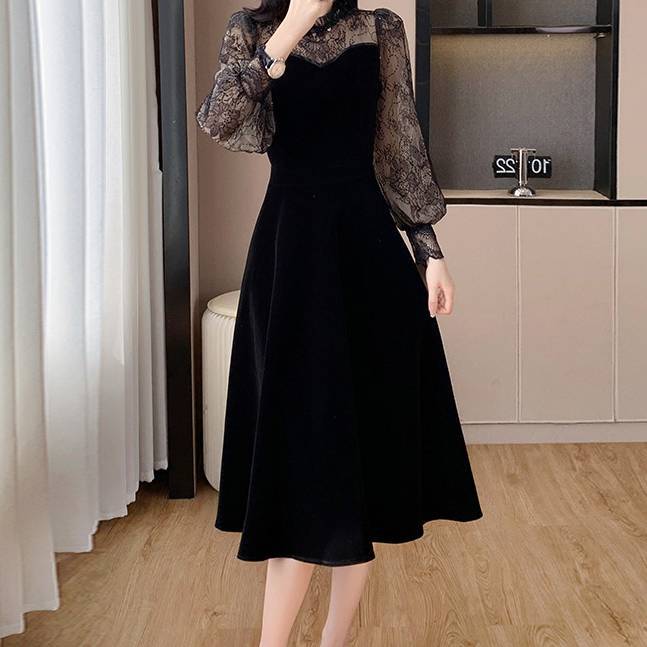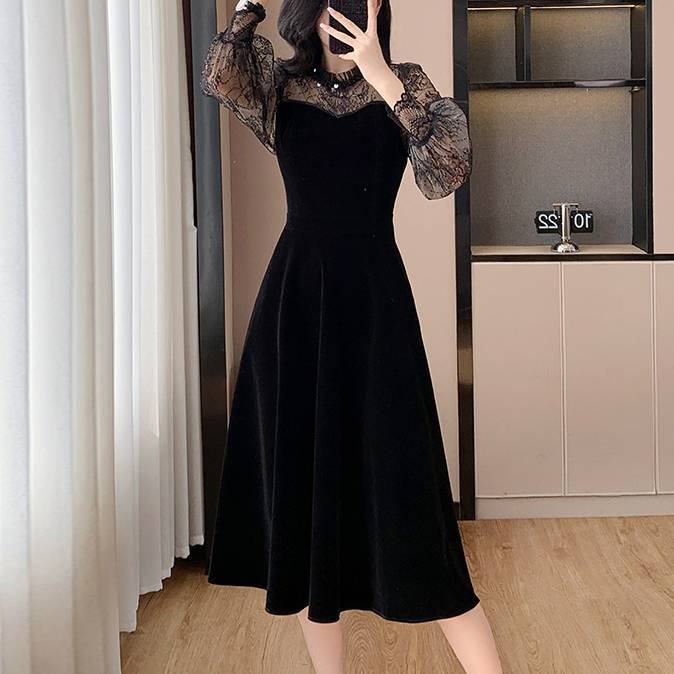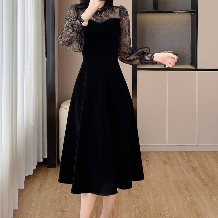 エレガントレーススリーブ ベルベットワンピース レディース ワンピース パーティードレス ミモレ丈 長袖 シースルー エレガンス 大人上品 ブラック 美脚 シルエット 体型カバー デート お呼ばれ フォーマル 秋冬 高見え 着痩せ 上質素材 C-OSS0233
