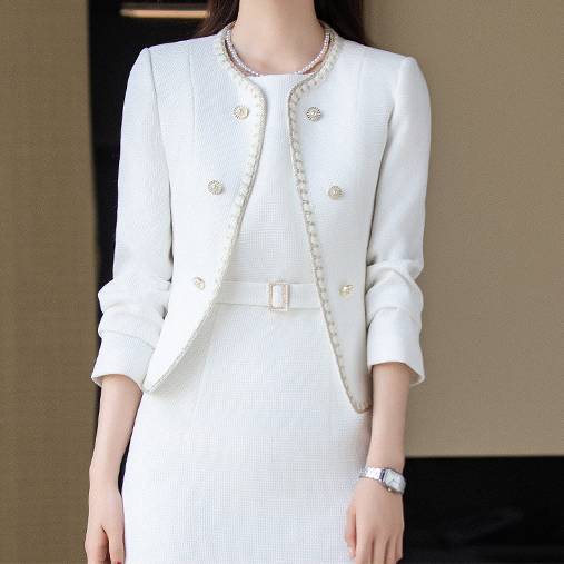 シンプルながらもラグジュアリーな金ボタンがポイントで、特別な日にも最適な一着です。