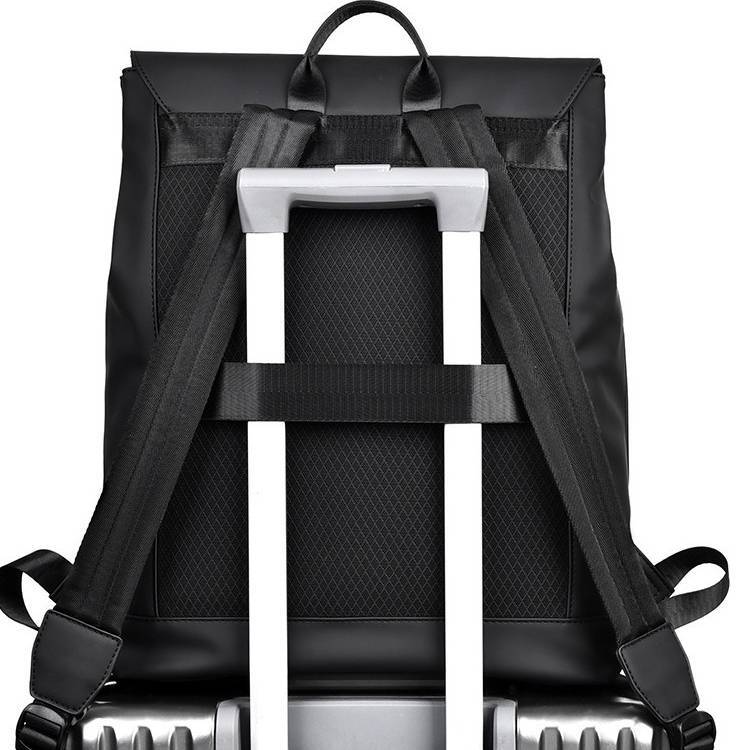 背面にはキャリーケース固定ベルトを搭載。出張や旅行時の移動を快適にサポートします。背面メッシュクッションと厚みのあるショルダーストラップで、長時間の使用でも負担を軽減。防水加工素材を使用しているため、急な雨でも安心です。