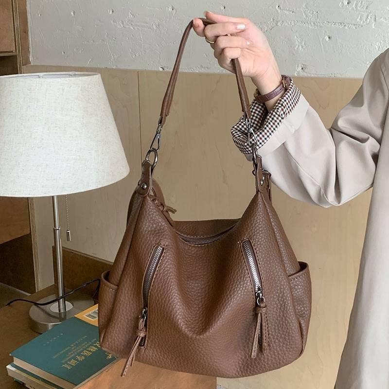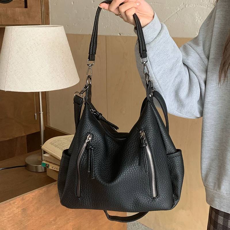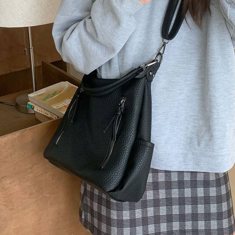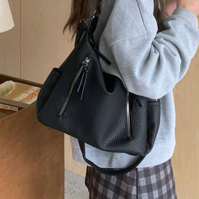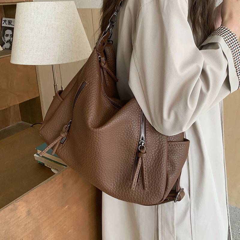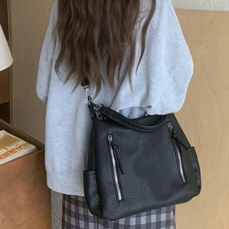 立体感のあるシボ加工が高級感を演出する、2WAY仕様のショルダーバッグ。柔らかなフォルムで体に自然にフィットし、カジュアルにもきれいめにも合わせやすい万能デザインです。フロントのジップデザインが程よいアクセントとなり、シンプルながらも洗練された印象を与えます。