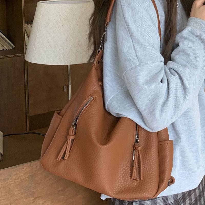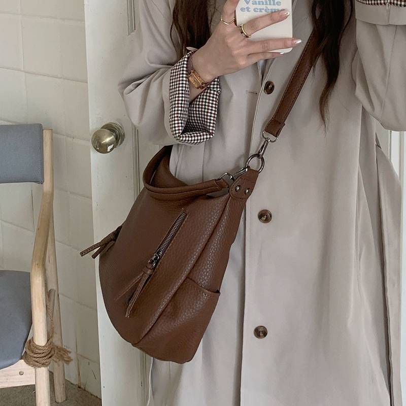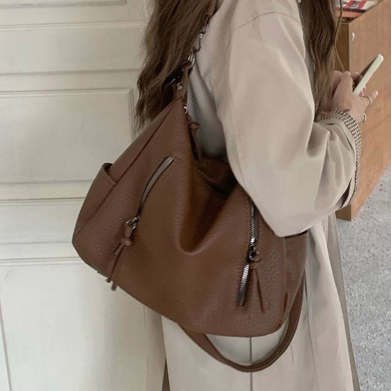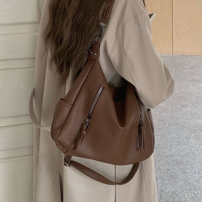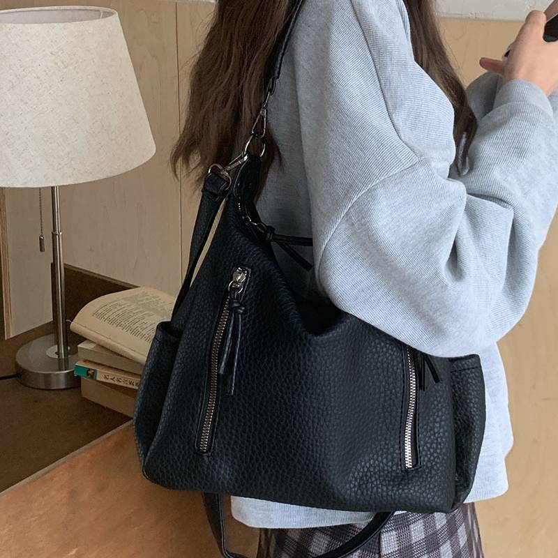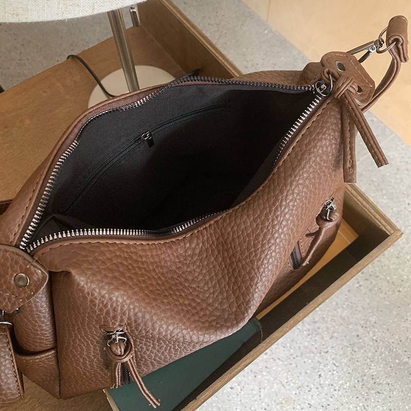 立体感のあるシボ加工が高級感を演出する、2WAY仕様のショルダーバッグ。柔らかなフォルムで体に自然にフィットし、カジュアルにもきれいめにも合わせやすい万能デザインです。フロントのジップデザインが程よいアクセントとなり、シンプルながらも洗練された印象を与えます。