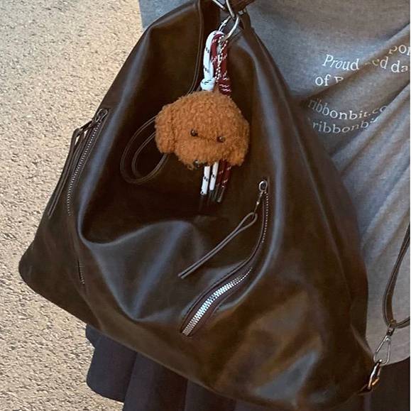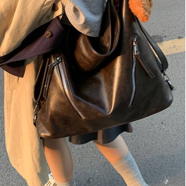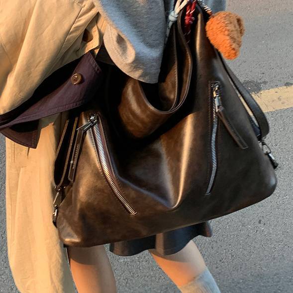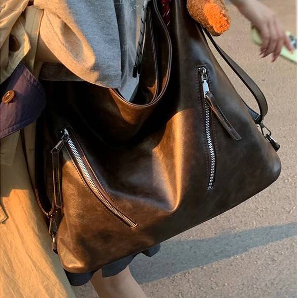 柔らかな光沢と深みのあるダークブラウンカラーが魅力の、ヴィンテージ調ビッグショルダーバッグ。体に自然に馴染むしなやかなフォルムで、こなれ感のある大人カジュアルを演出します。フロントのジップデザインが程よいアクセントとなり、シンプルながらも存在感のある仕上がりです。
