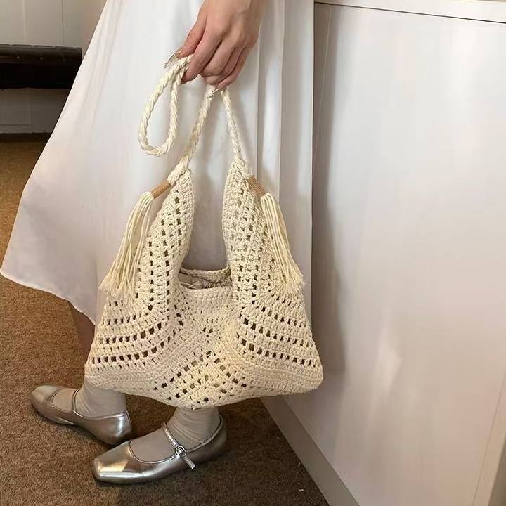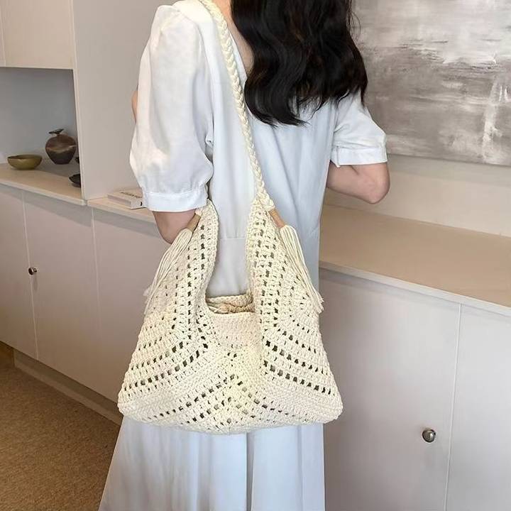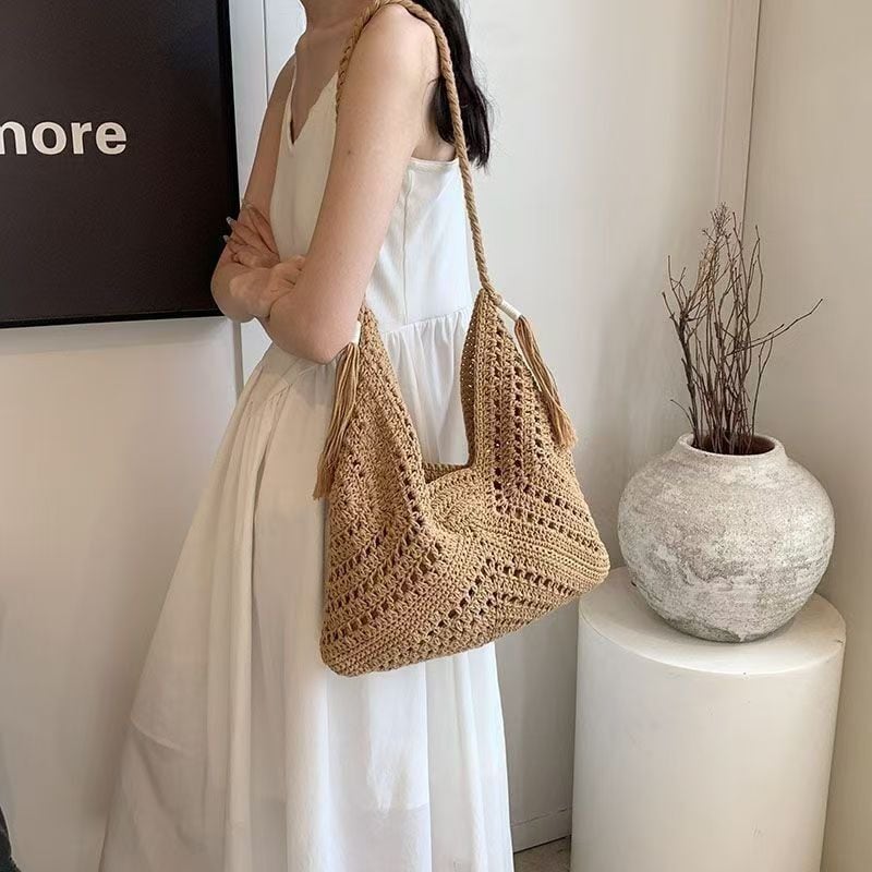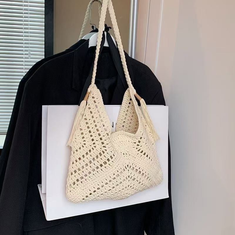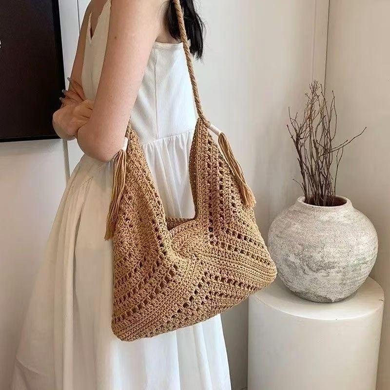 ナチュラルな風合いが魅力のかぎ編みショルダーバッグ。柔らかい編み込みデザインが特徴で、季節感のあるおしゃれなスタイルを演出してくれるトレンドバッグです。シンプルなデザインながら存在感があり、コーディネートのアクセントとしても活躍します。