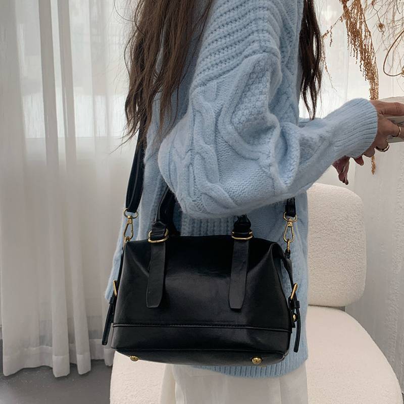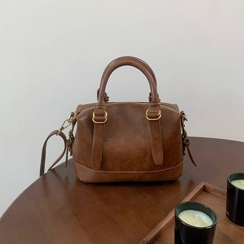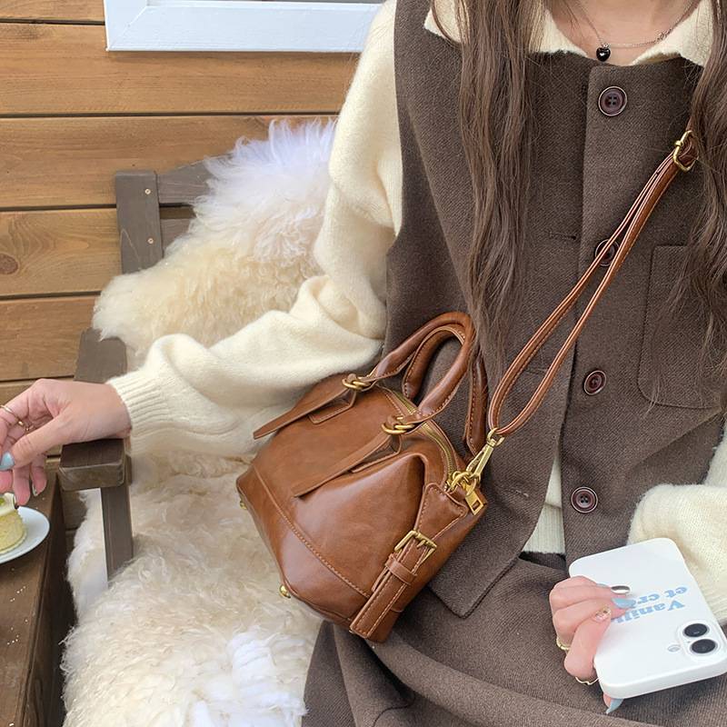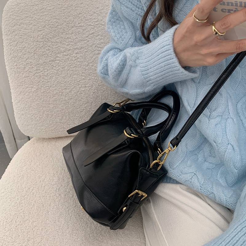 シンプルで洗練されたデザインが魅力のミニボストンショルダーバッグ。丸みのあるフォルムと上品なレザー調素材が、大人っぽい落ち着いた雰囲気を演出してくれるおしゃれバッグです。カジュアルコーデからきれいめコーデまで幅広く合わせやすく、韓国風ファッションにもぴったりのアイテムです。