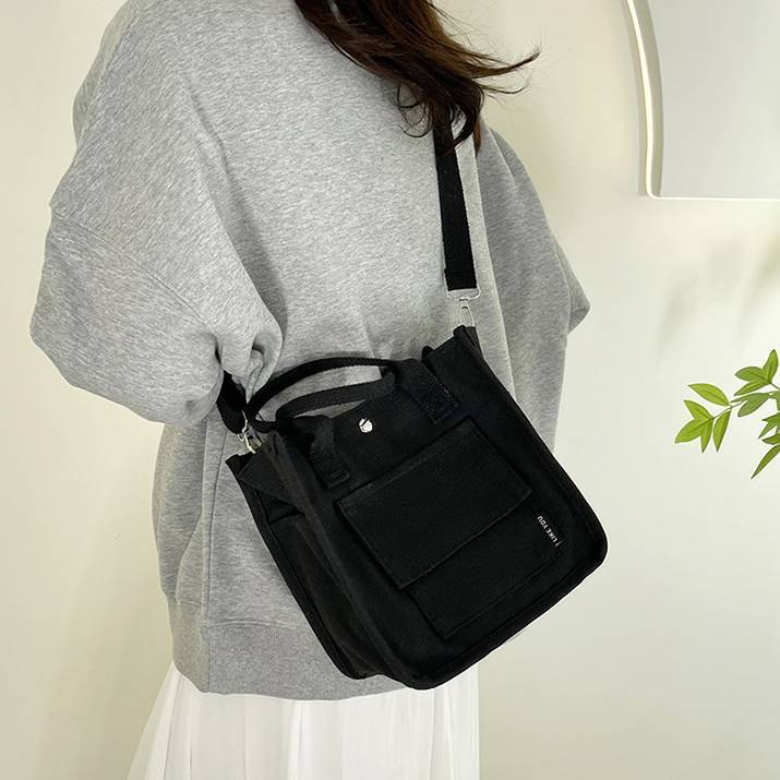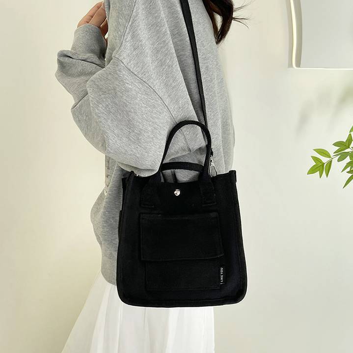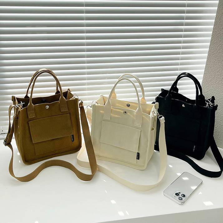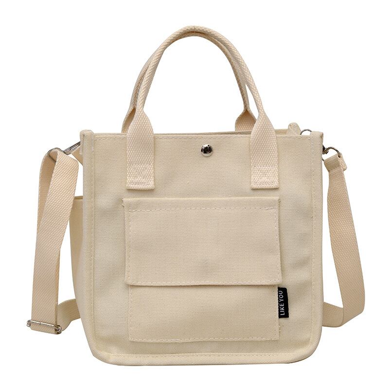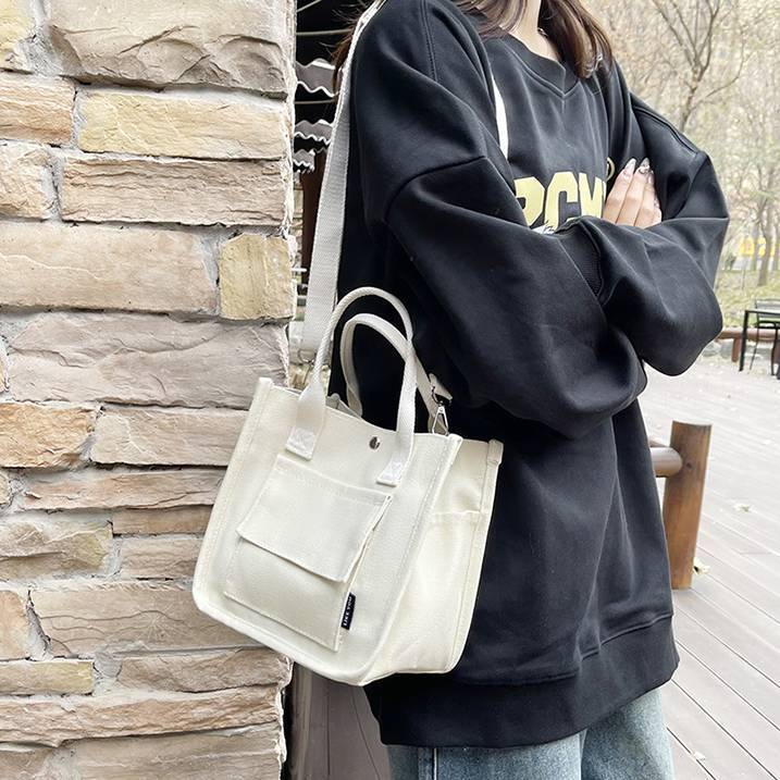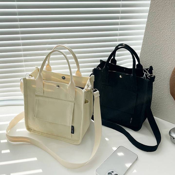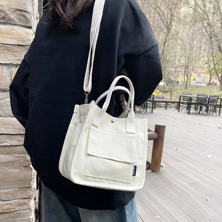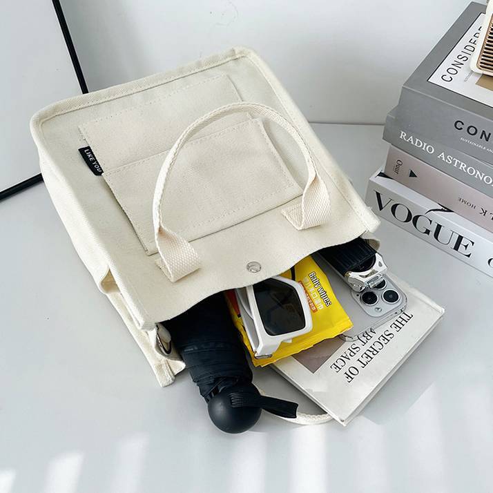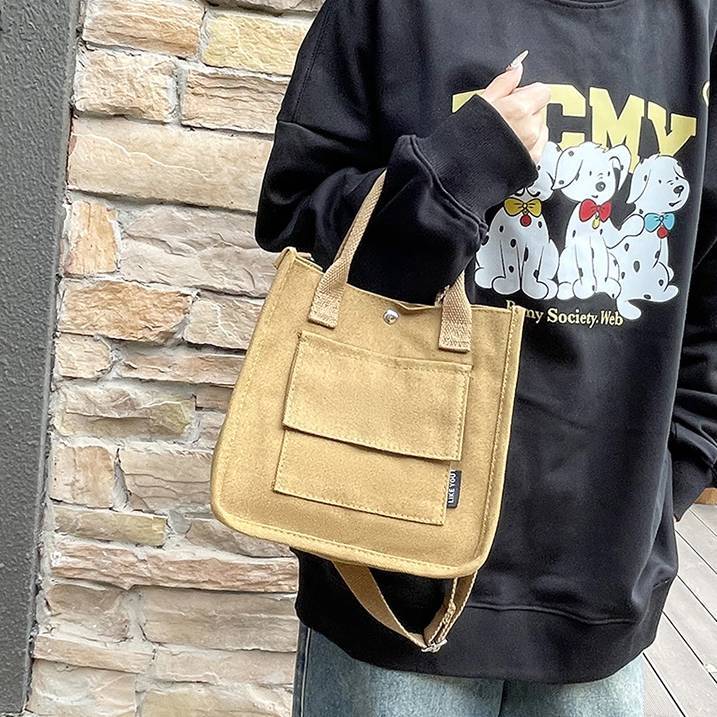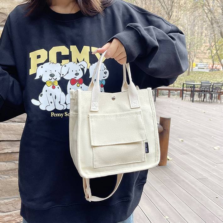 コンパクトで使いやすいキャンバス素材のミニトートバッグ。シンプルでカジュアルなデザインが魅力で、韓国風ファッションやデイリーコーデにぴったりのアイテムです。