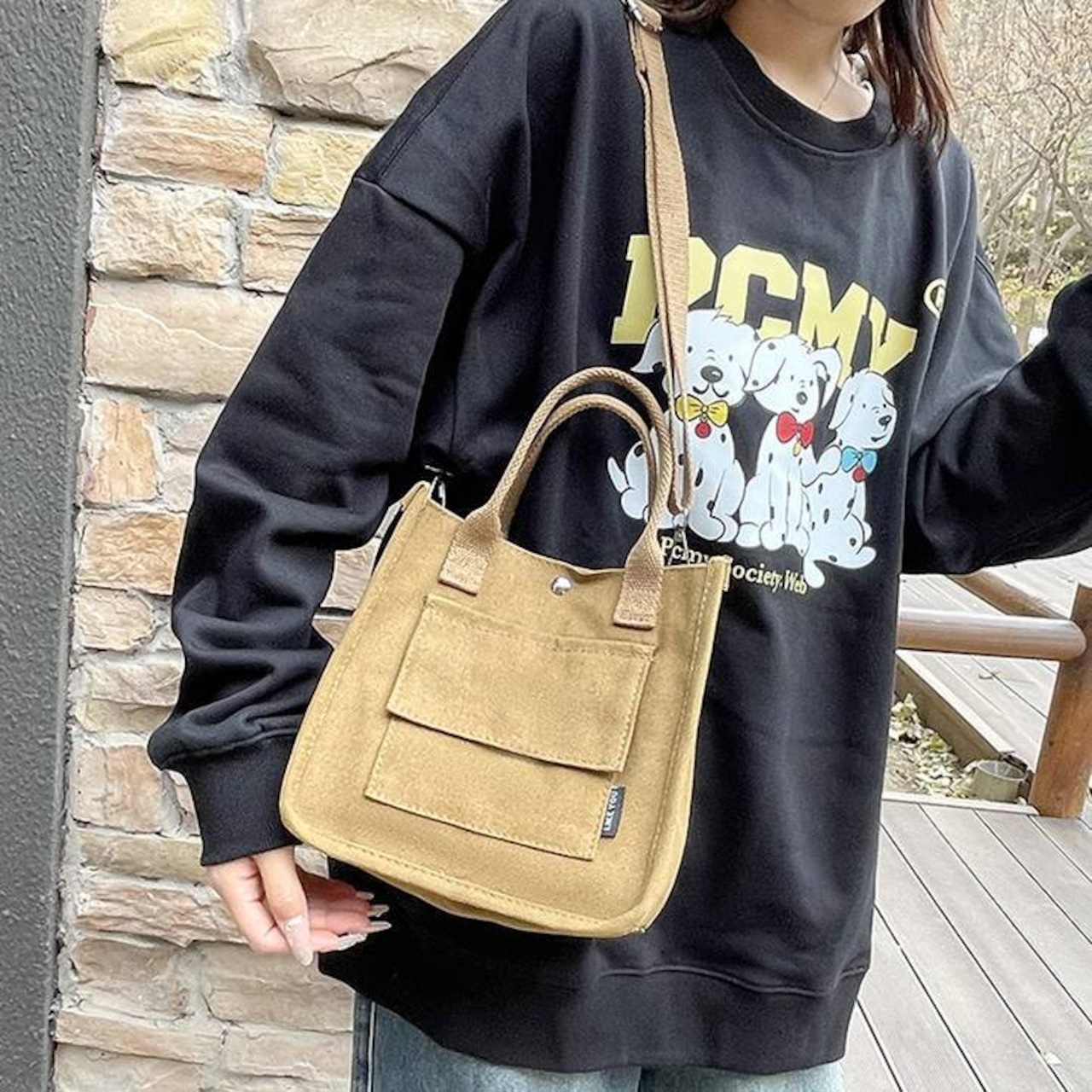 ブラック・ブラウン・ホワイトの使いやすいカラー展開で、カジュアルコーデから韓国ストリートスタイルまで幅広く合わせやすいバッグです。