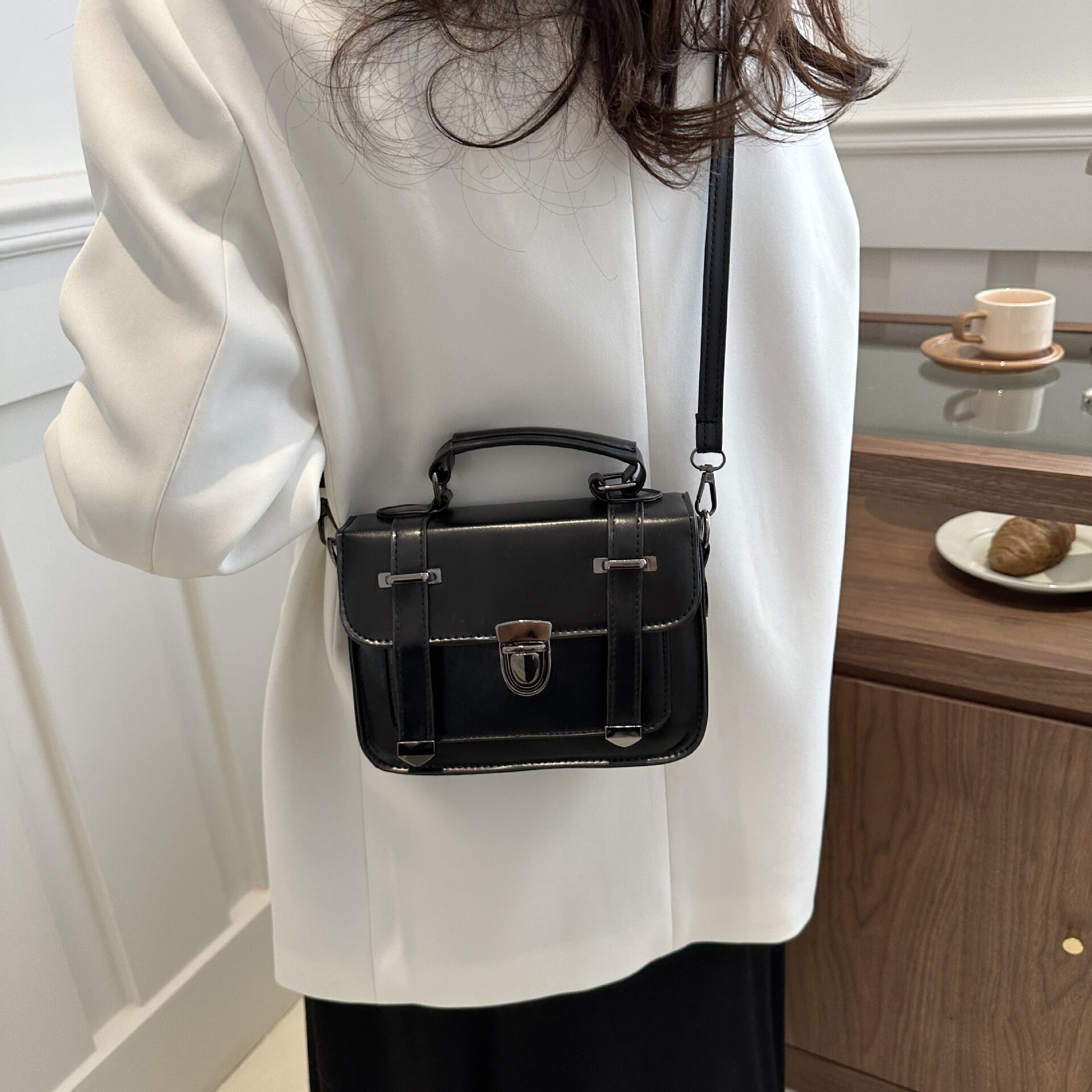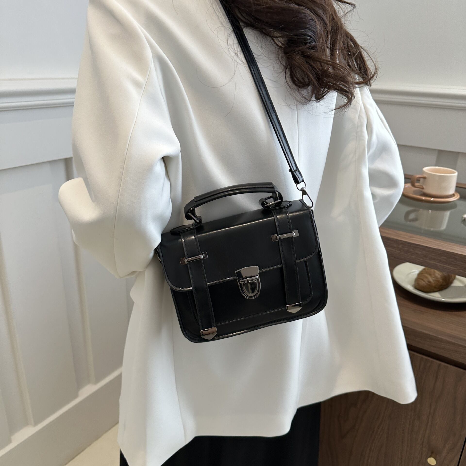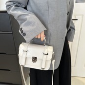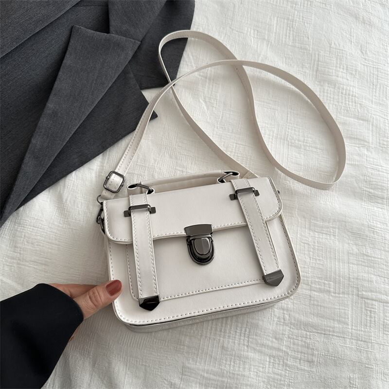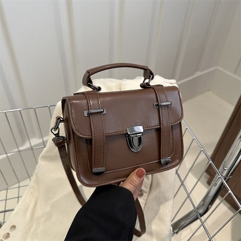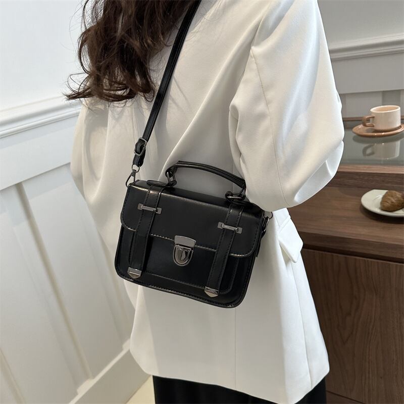 クラシカルなデザインが魅力のミニショルダーバッグ。フロントのベルト風ディテールとメタル金具がアクセントになり、シンプルながらも上品で洗練された印象を演出します