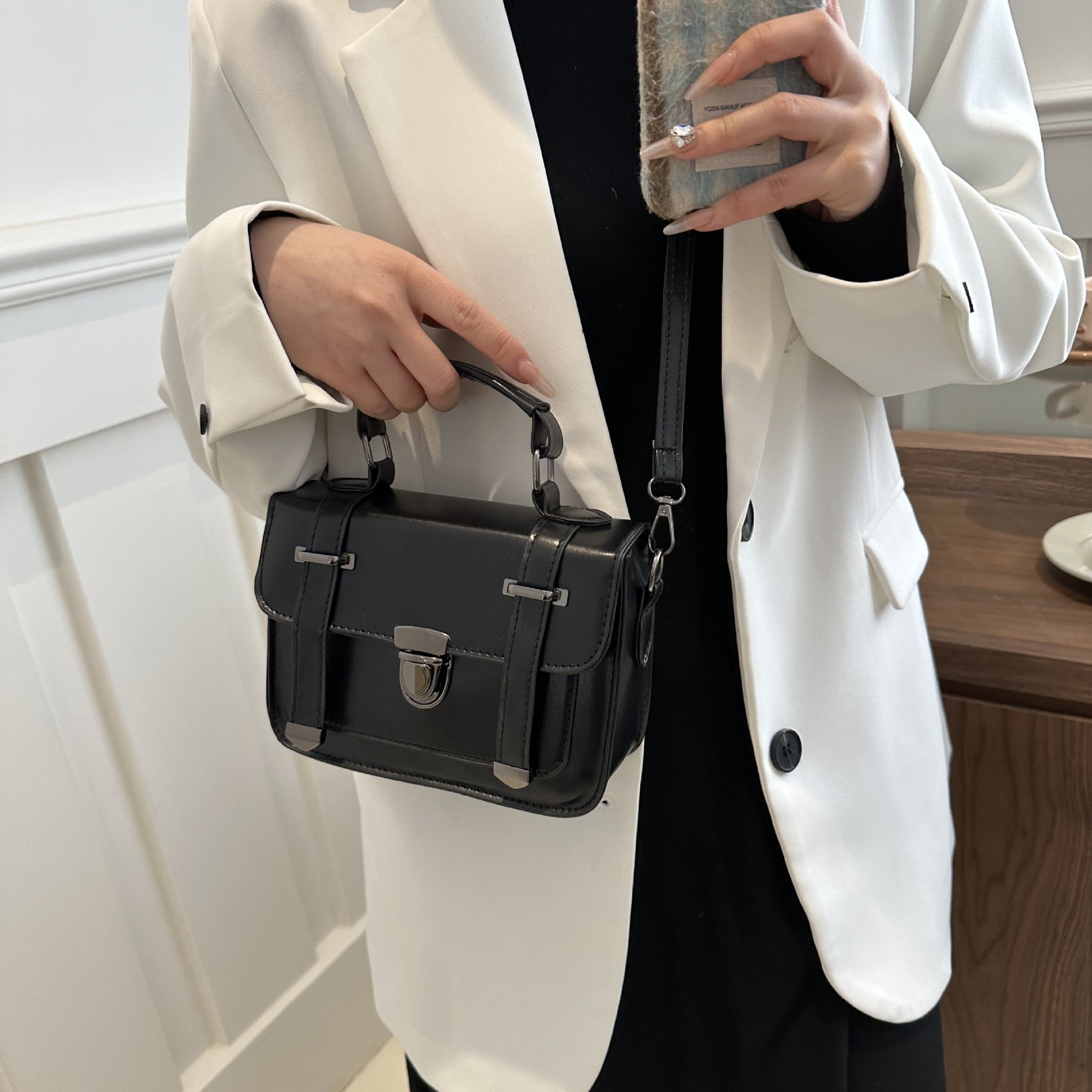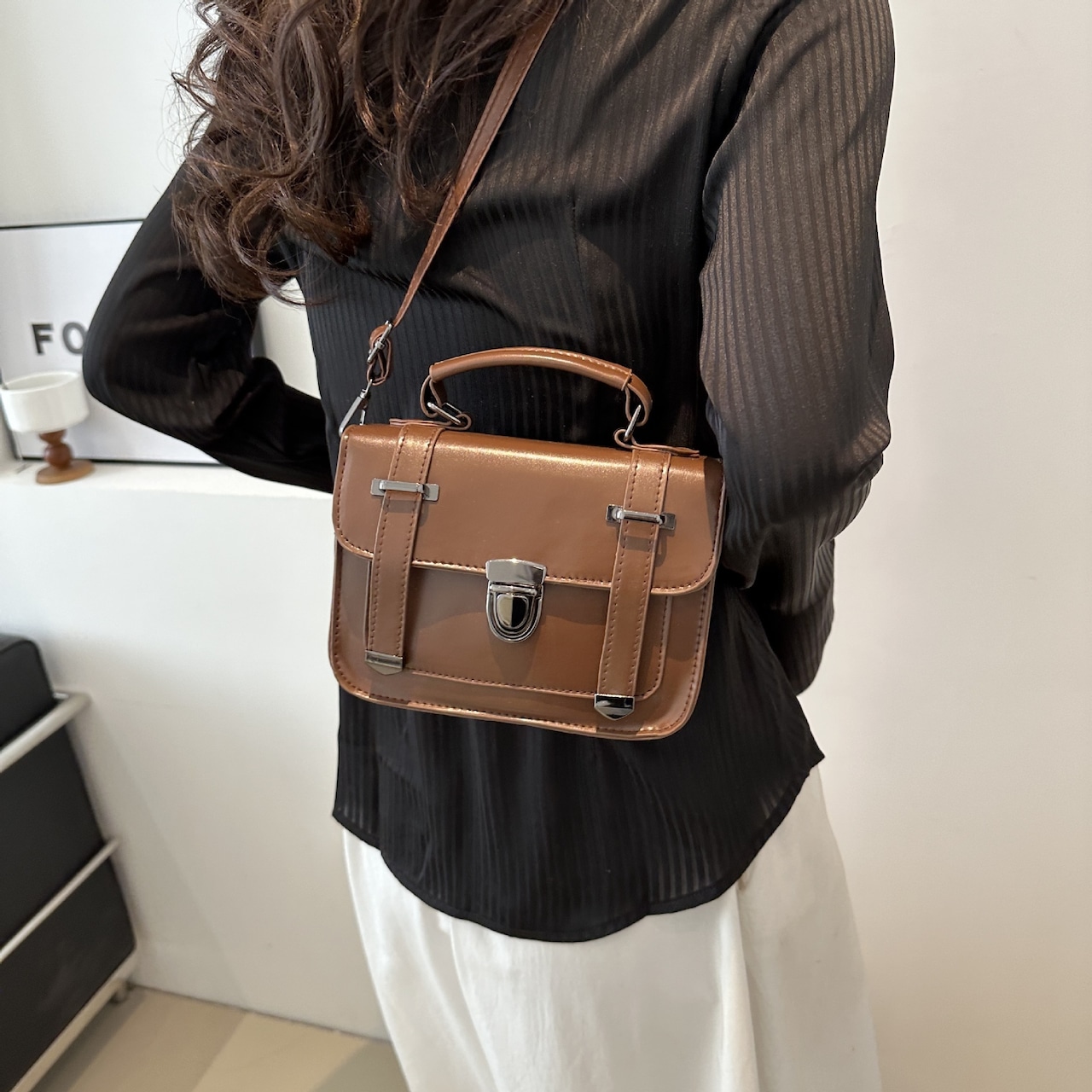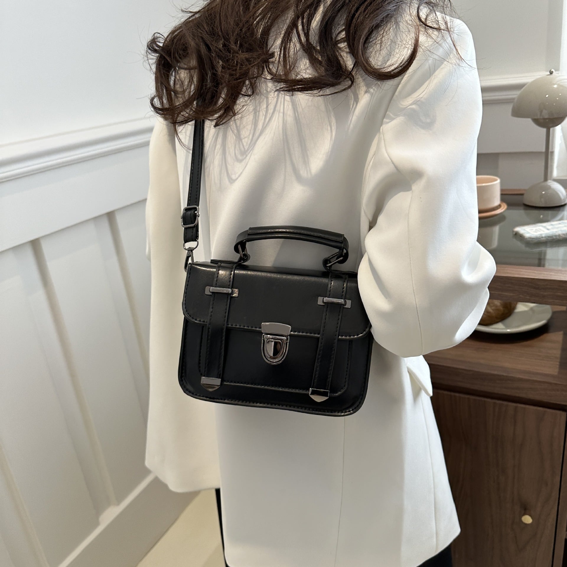 クラシカルなデザインが魅力のミニショルダーバッグ。フロントのベルト風ディテールとメタル金具がアクセントになり、シンプルながらも上品で洗練された印象を演出します