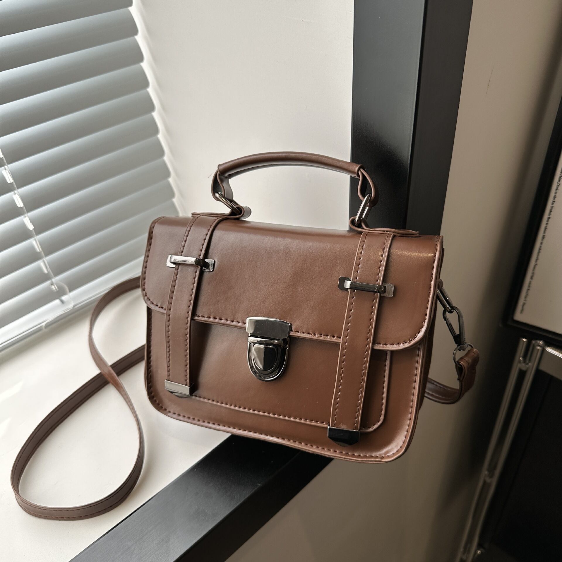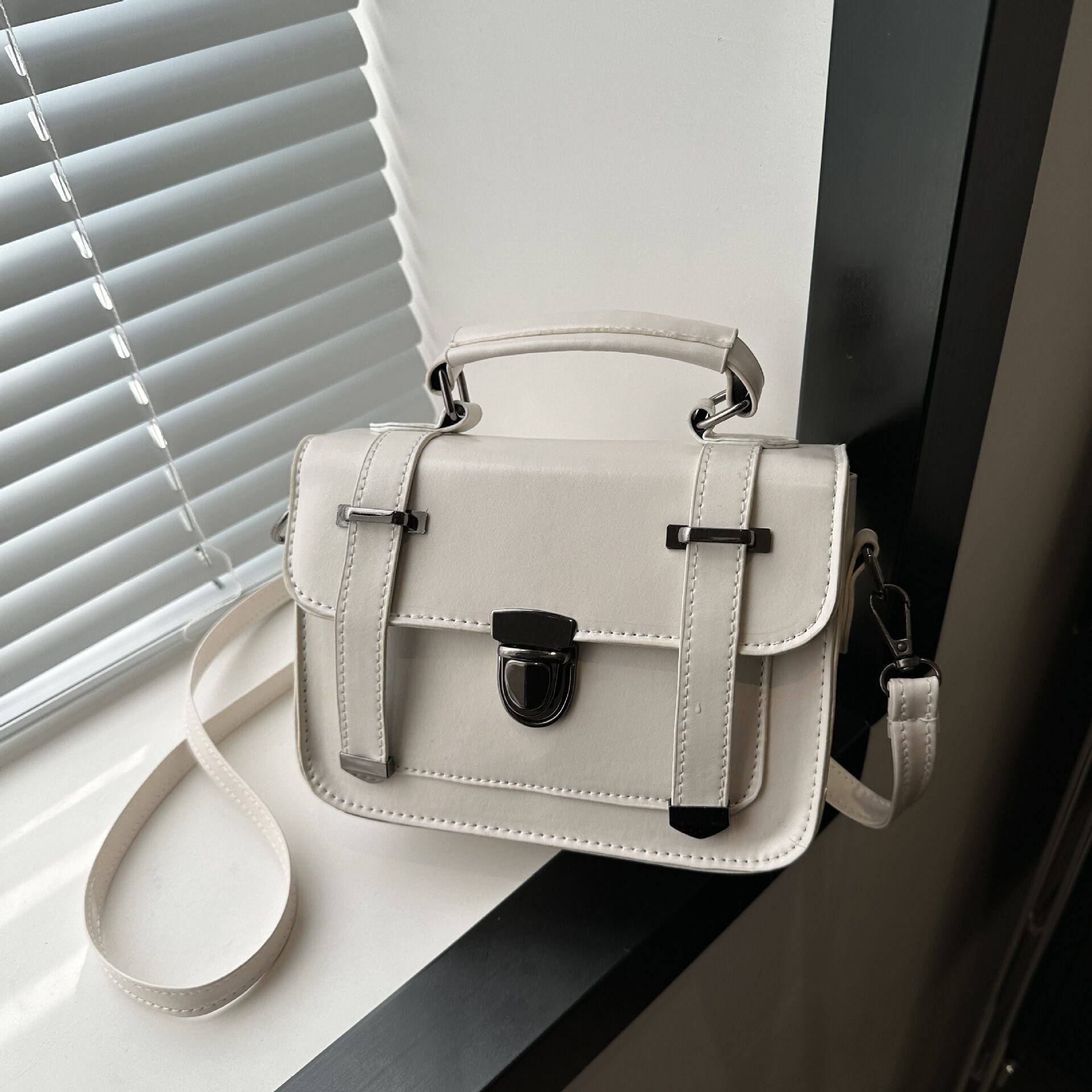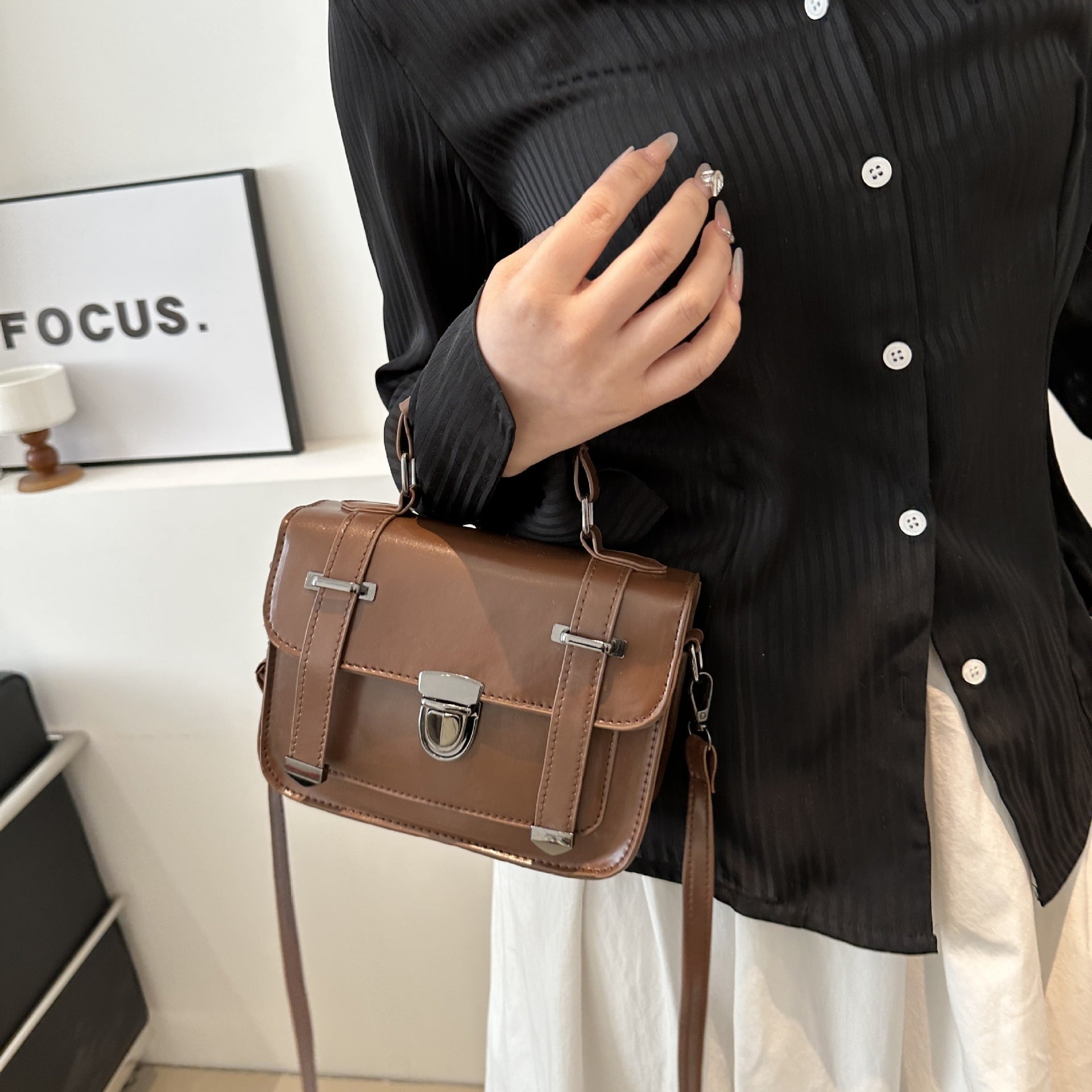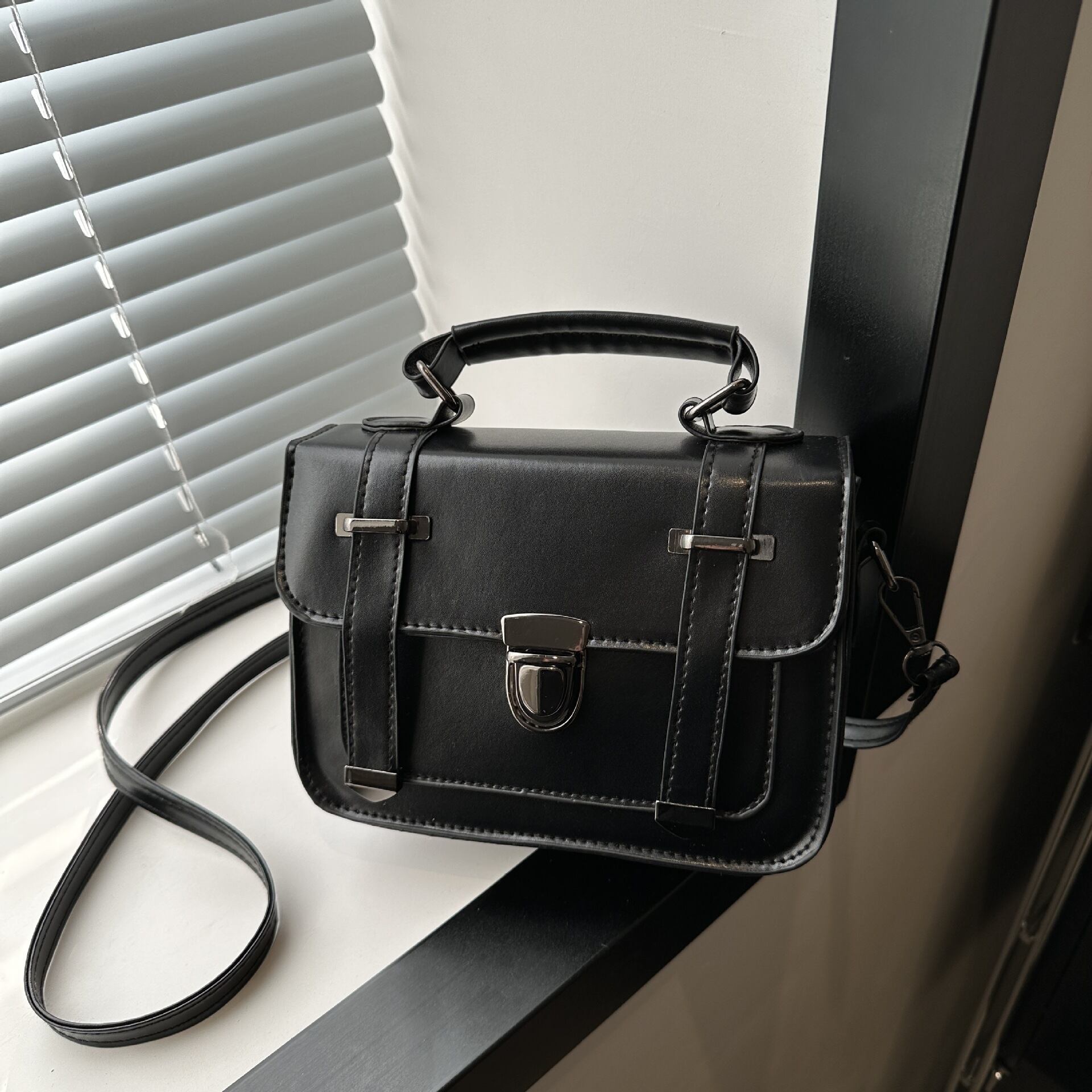 クラシカルなデザインが魅力のミニショルダーバッグ。フロントのベルト風ディテールとメタル金具がアクセントになり、シンプルながらも上品で洗練された印象を演出します