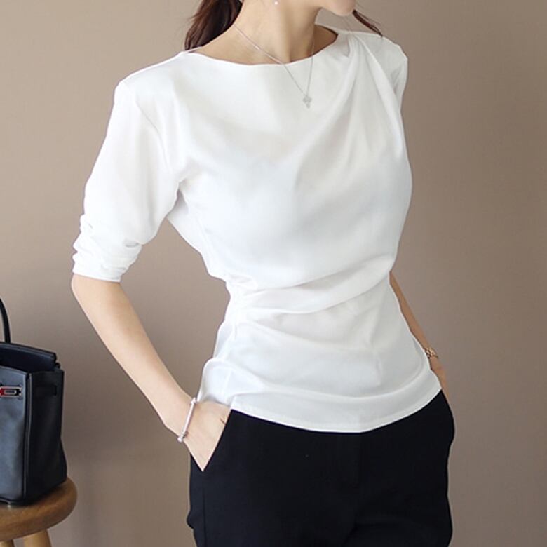 与えつつも、上品で大人っぽくきまるトップスシャツ。