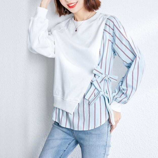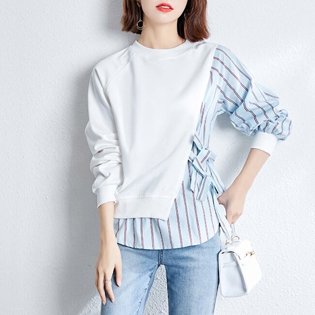 トップス レディース 春夏 秋冬 春 夏 秋 冬 白 ブラウス シャツ ドルマン 長袖 レイヤード 長袖トップス チュニック ストライプ カットソー ストライプシャツ ホワイト ライトブルー 韓国 ゆったり 長袖トップス オフィス カジュアル OL 上品 大人 10代 20代 30代 40代 C-TSS0048
