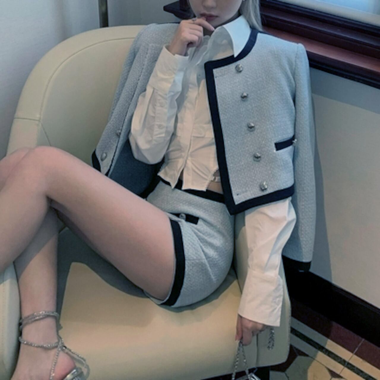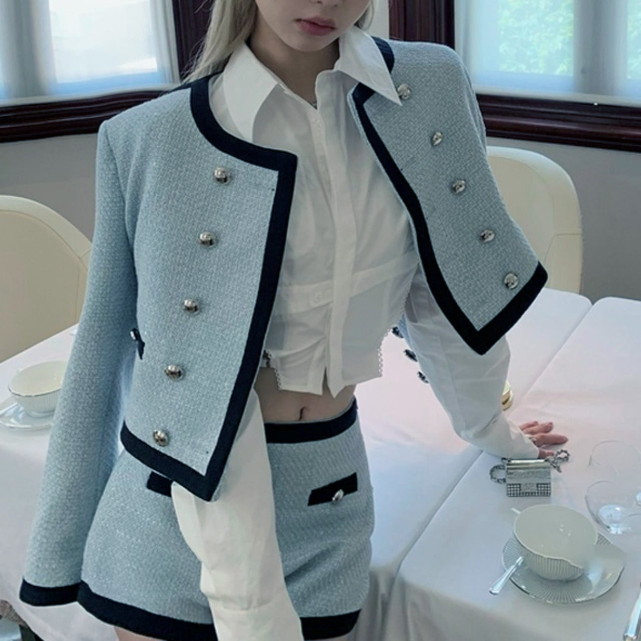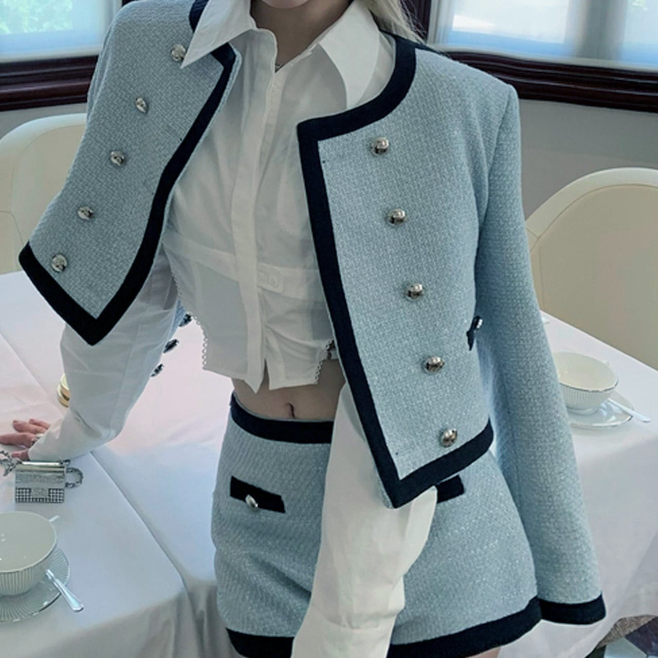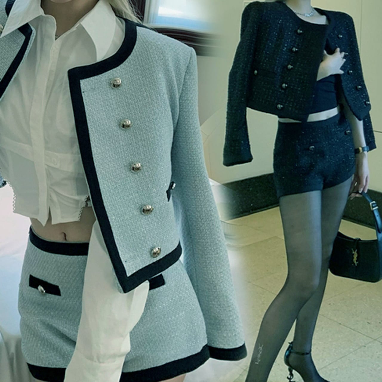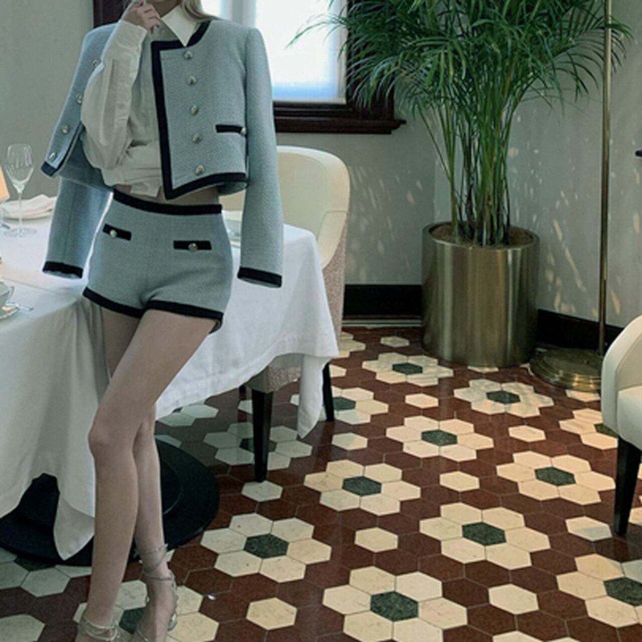 クロップド丈のジャケットとショートパンツで