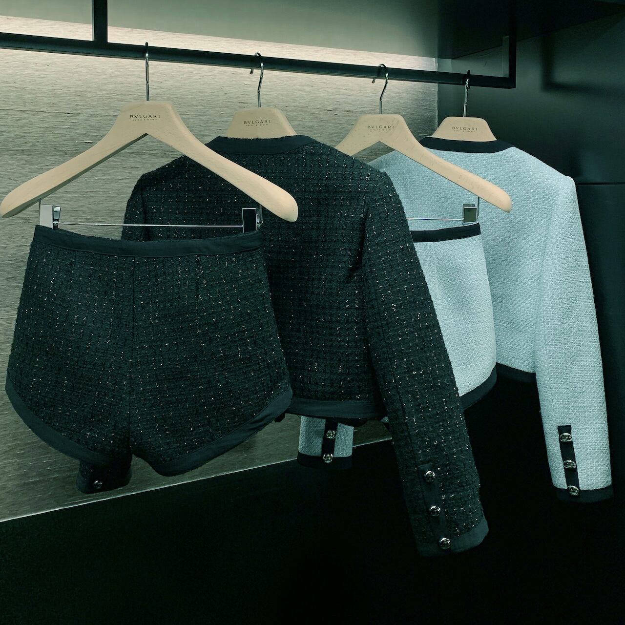 ジャケットとショートパンツのセットアップ。