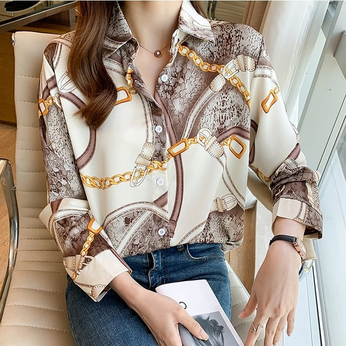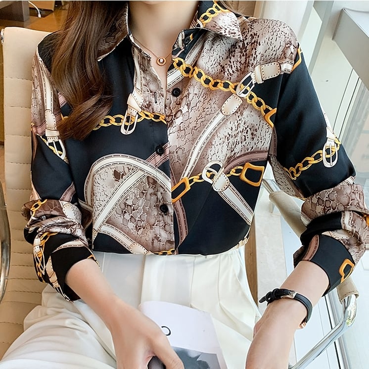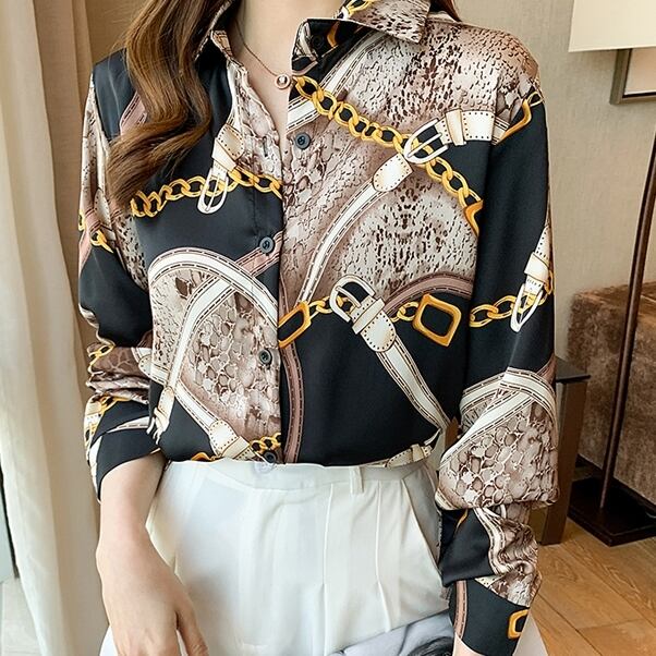 商品名:チェーンデザイン サテン 長袖 ブラウス シャツ
