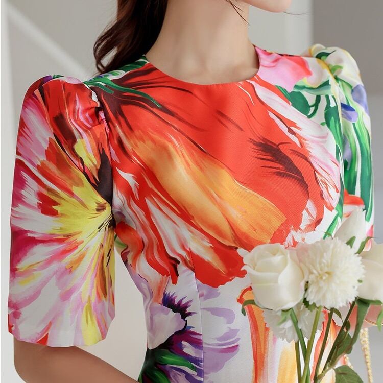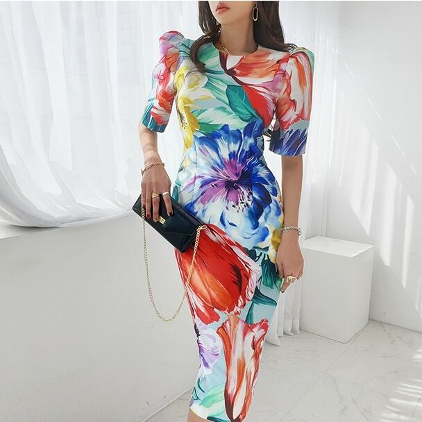 商品名:花柄 パフスリーブ タイトワンピース ドレス